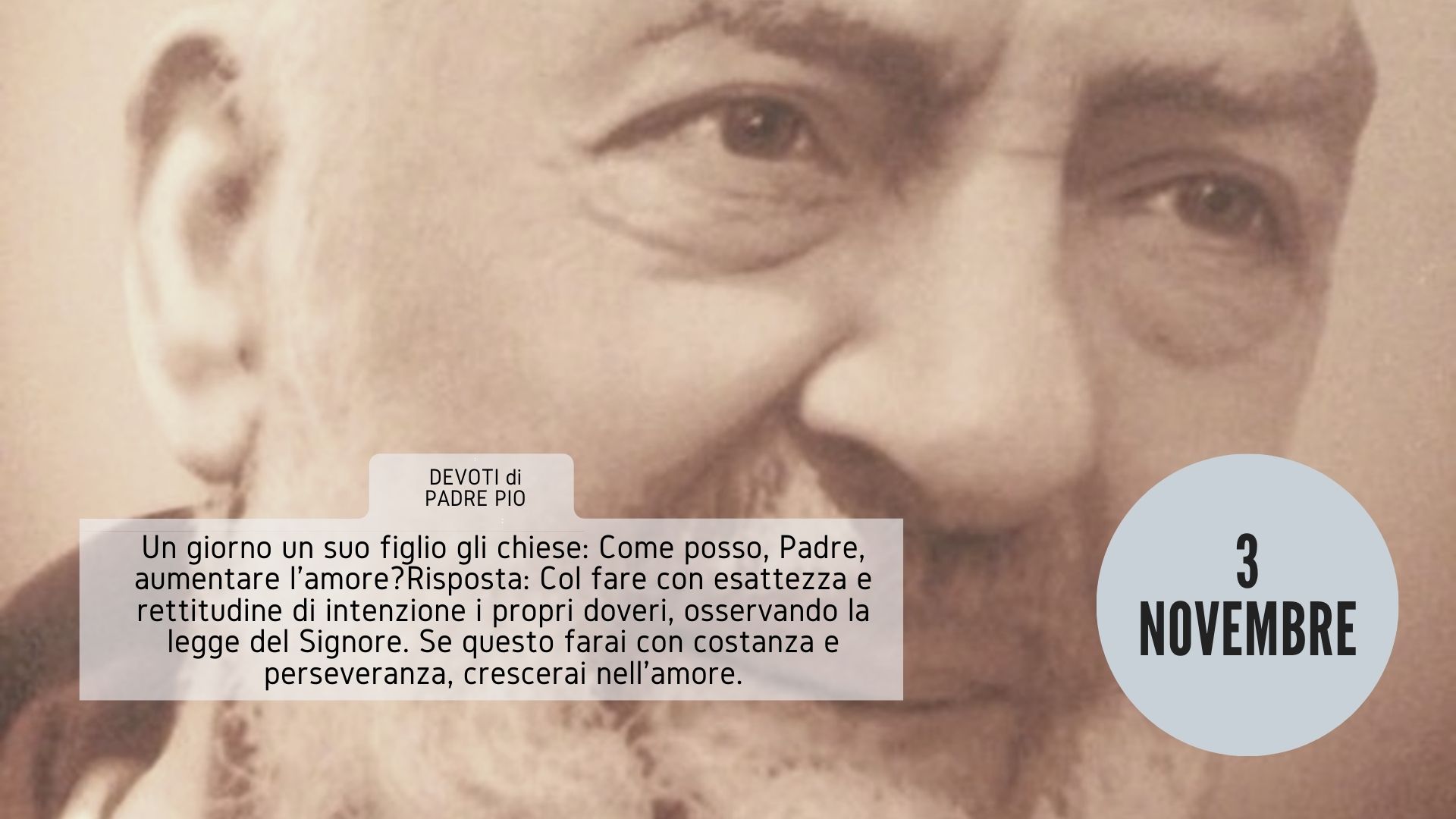 Oggi 3 novembre Padre Pio ci dice: Un giorno un figlio spirituale chiese a Padre Pio: Come posso, Padre, aumentare l’amore? Padre Pio rispose: “col fare con esattezza e rettitudine…