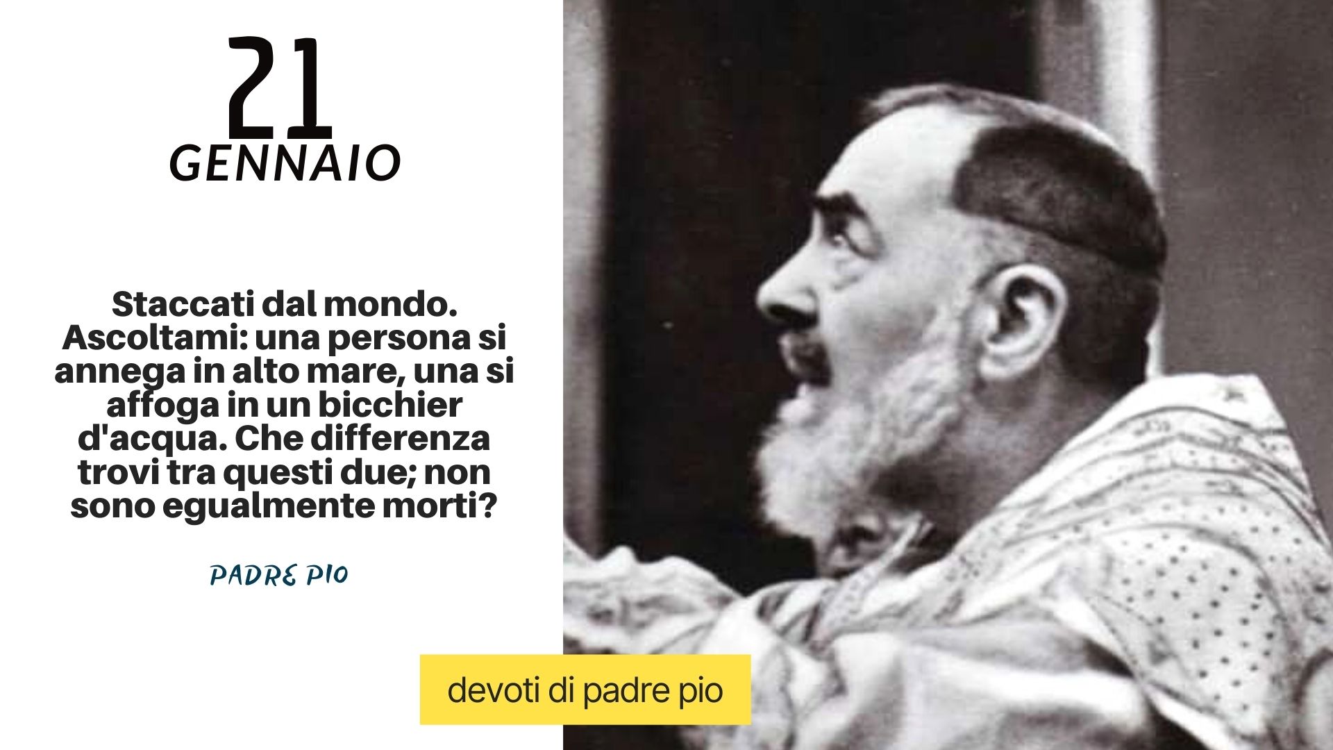 Oggi 21 gennaio Padre Pio ci dice: Staccati dal mondo. Ascoltami: una persona si annega in alto mare, una si affoga in un bicchier d’acqua. Che differenza trovi tra questi…