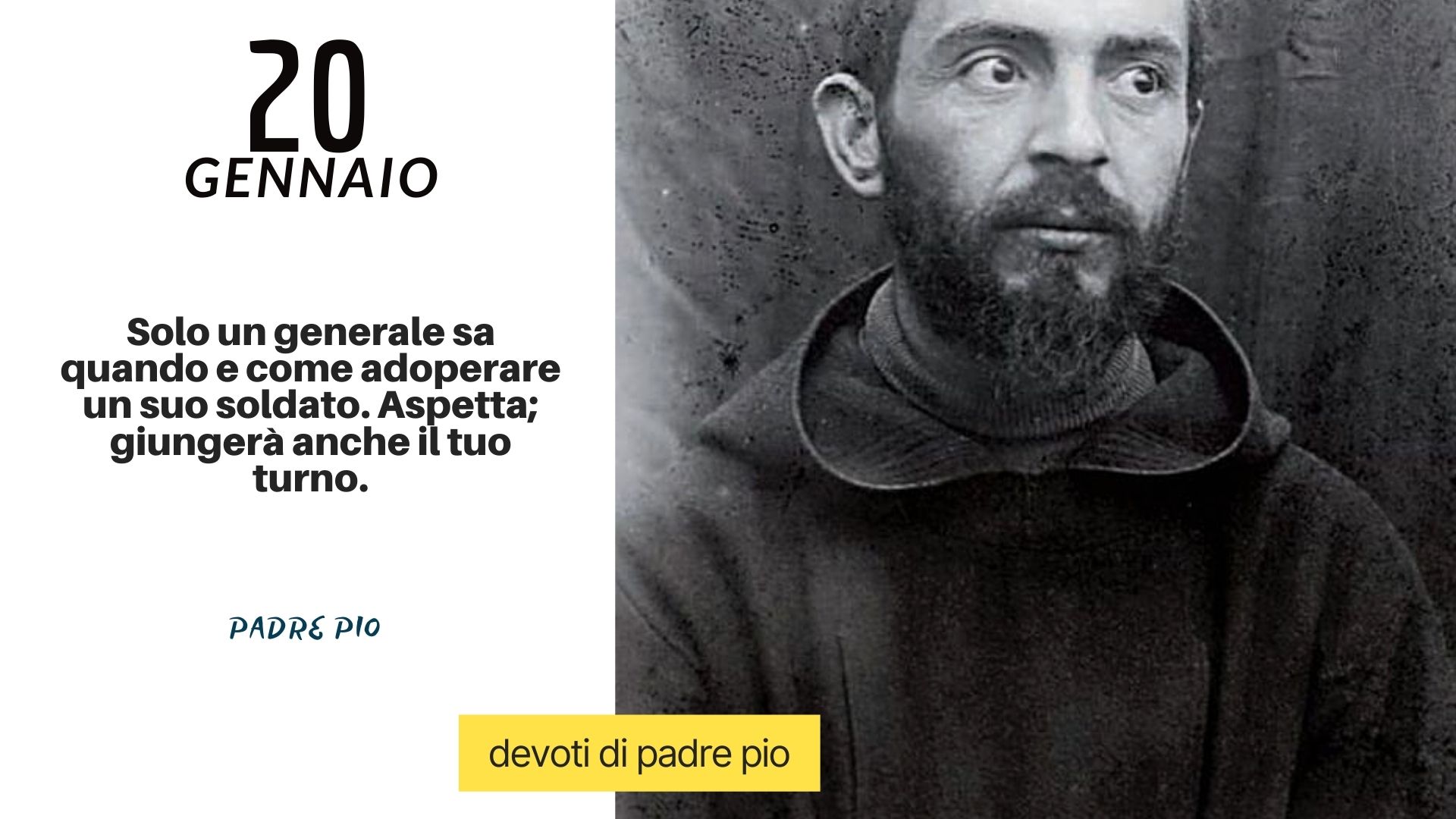 Oggi 20 gennaio Padre Pio ci dice: Solo un generale sa quando e come adoperare un suo soldato. Aspetta; giungerà anche il tuo turno. (Padre Pio da Pietrelcina) contattaci: devoti@devotidipadrepio.it