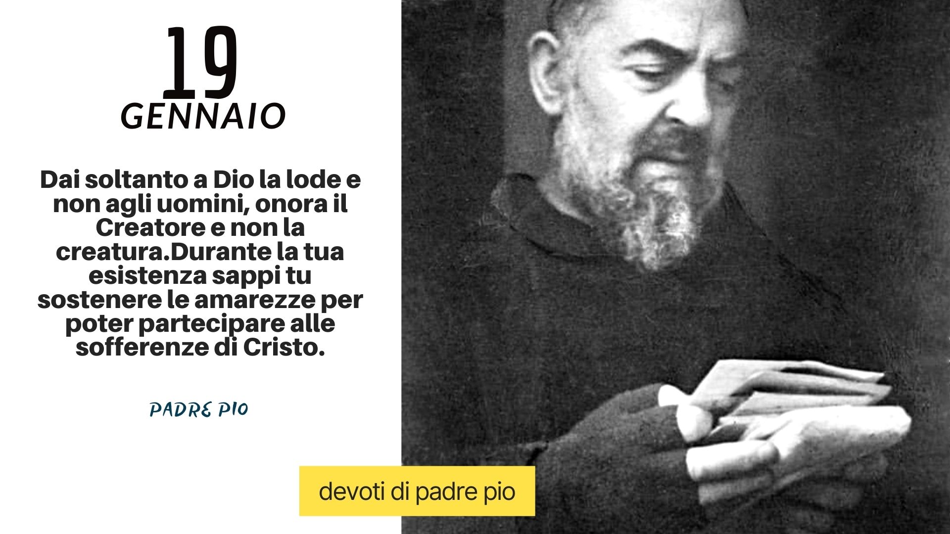 Oggi 19 gennaio Padre Pio ci dice: Dai soltanto a Dio la lode e non agli uomini, onora il Creatore e non la creatura. Durante la tua esistenza sappi tu…