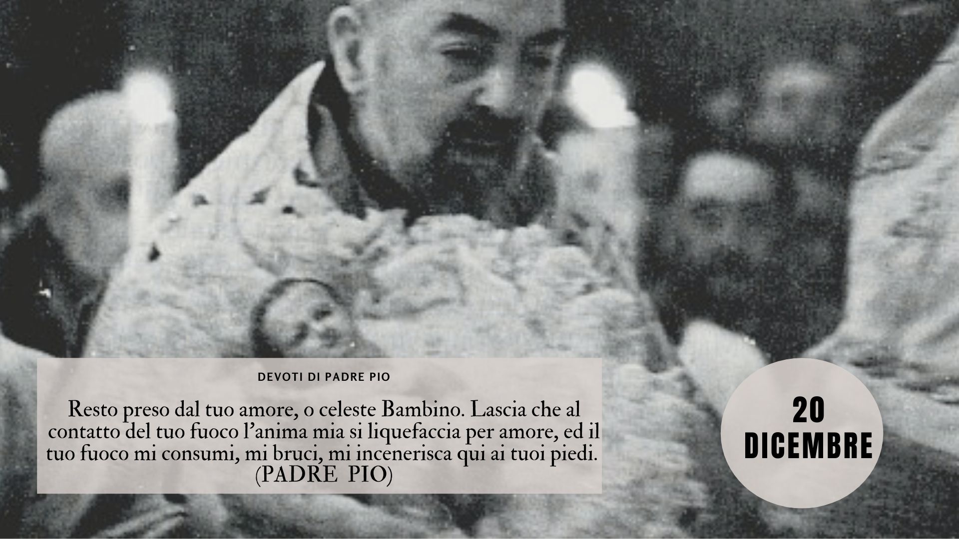 Oggi 20 dicembre Padre Pio ci dice: Le tue tenerezze conquidono il mio cuore e resto preso dal tuo amore, o celeste Bambino. Lascia che al contatto del tuo fuoco…